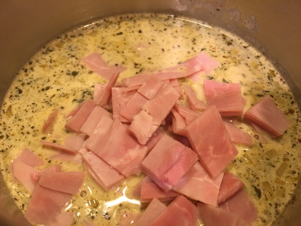 Die Schinkenwürfel dazugeben und die Sauce kurz aufkochen lassen.
