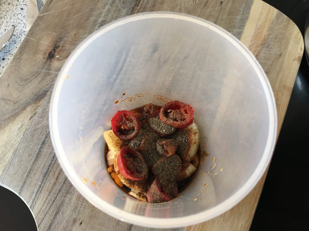Alles in eine hohe Schüssel geben und mit Schwarzem Pfeffer aus der Mühle und dem Rauchpaprika würzen. Am besten eignet sich ein hoher Messbecher als Schüssel. So geht beim Pürieren der Chili BBQ Sauce nichts daneben.