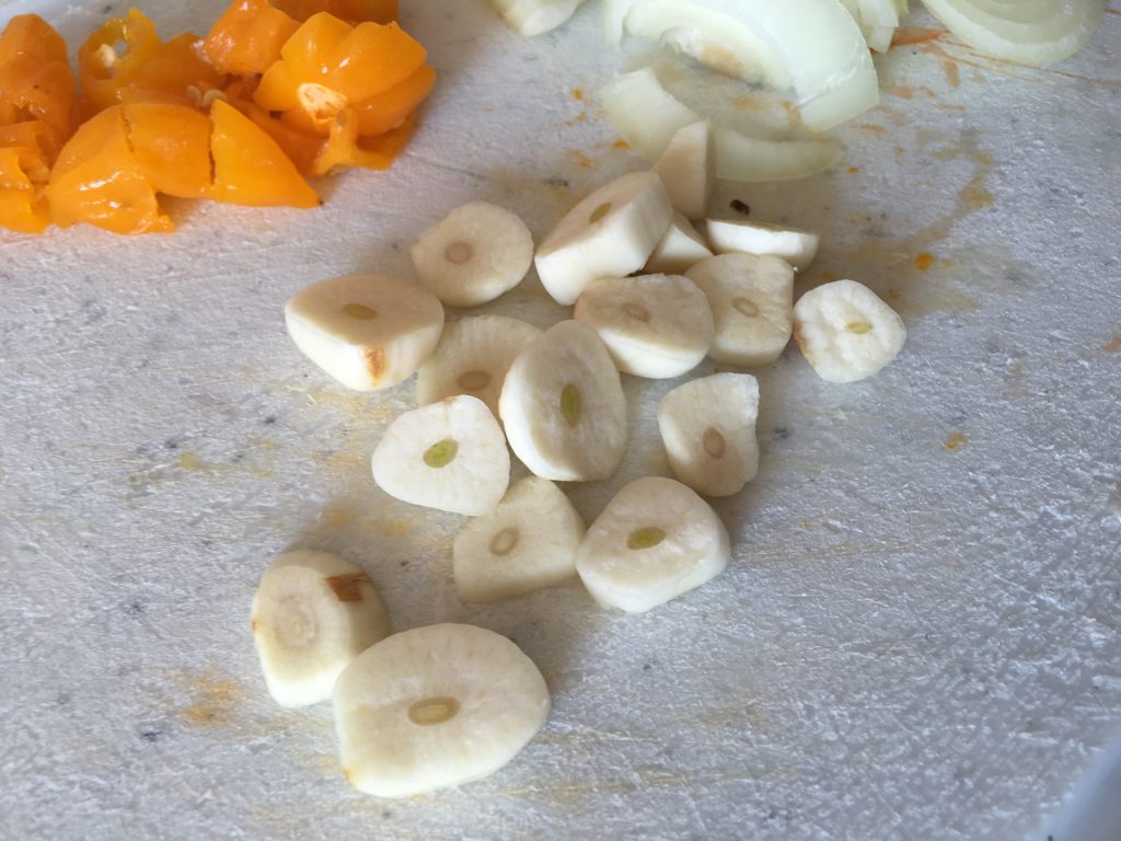 Den Knoblauch schälen und ebenfalls in grobe Stücke schneiden.