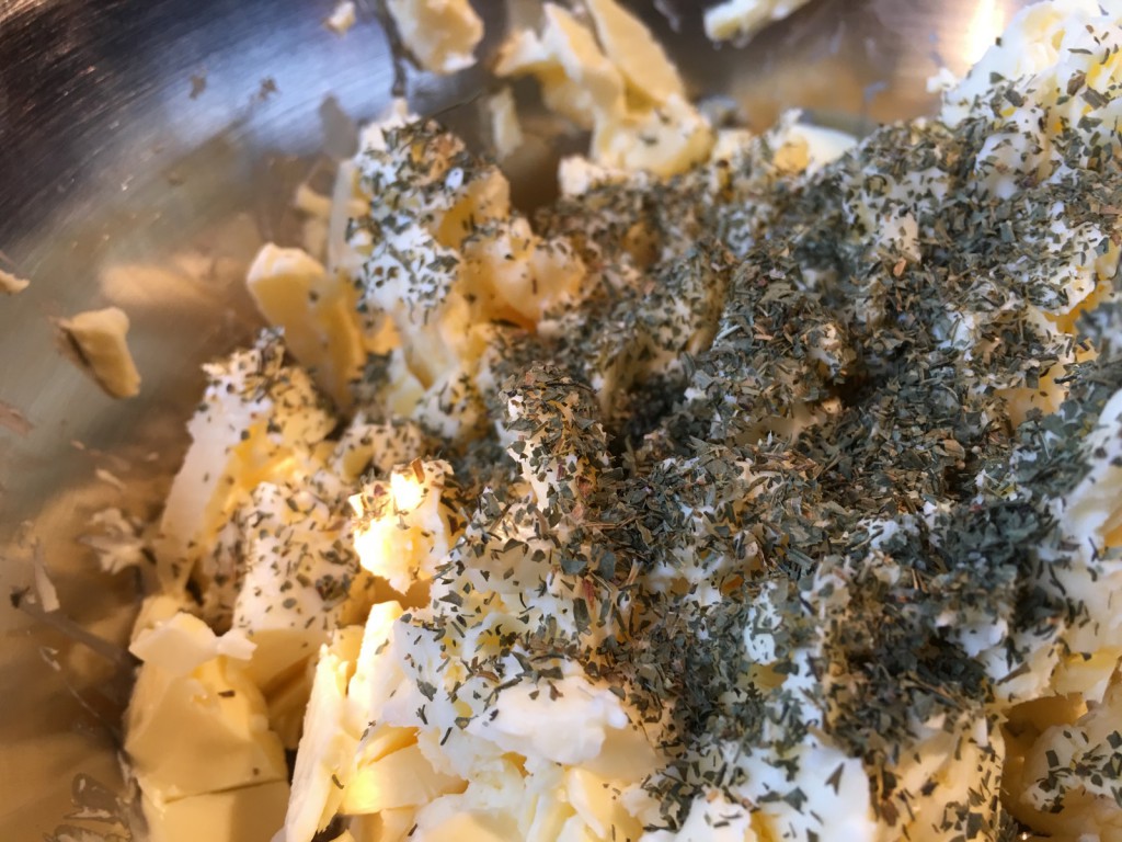 Das Kräuterbuttergewürz hinzufügen und mit einer Gabel gut mit der Butter vermengen. Statt Kräuterbuttergewürz können natürlich auch frisch gehackte oder getrocknete Kräuter verwendet werden. Für eine würzige Kräuterbutter-Note eignen sich Kräuter wie Petersilie, Schnittlauch, Knoblauch, Dill, Oregano, Basilikum, Thymian und Rosmarin.
