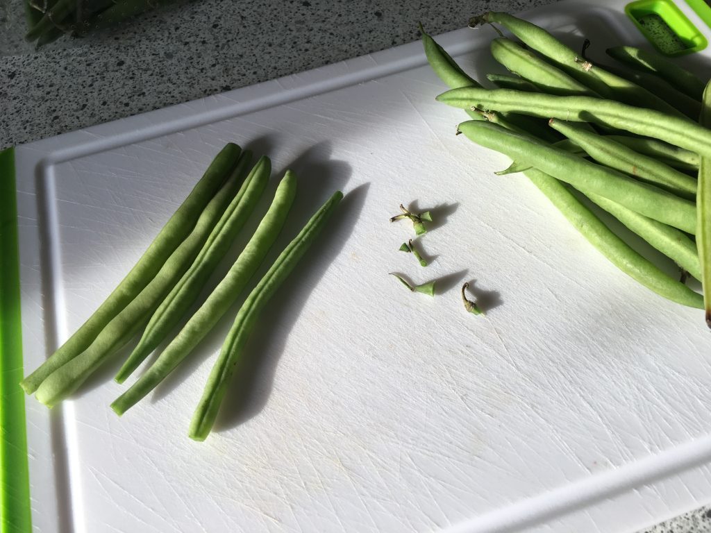 Die Spitzen der Bohnen abschneiden und die Grünen Bohnen anschließend in einem Seier waschen.