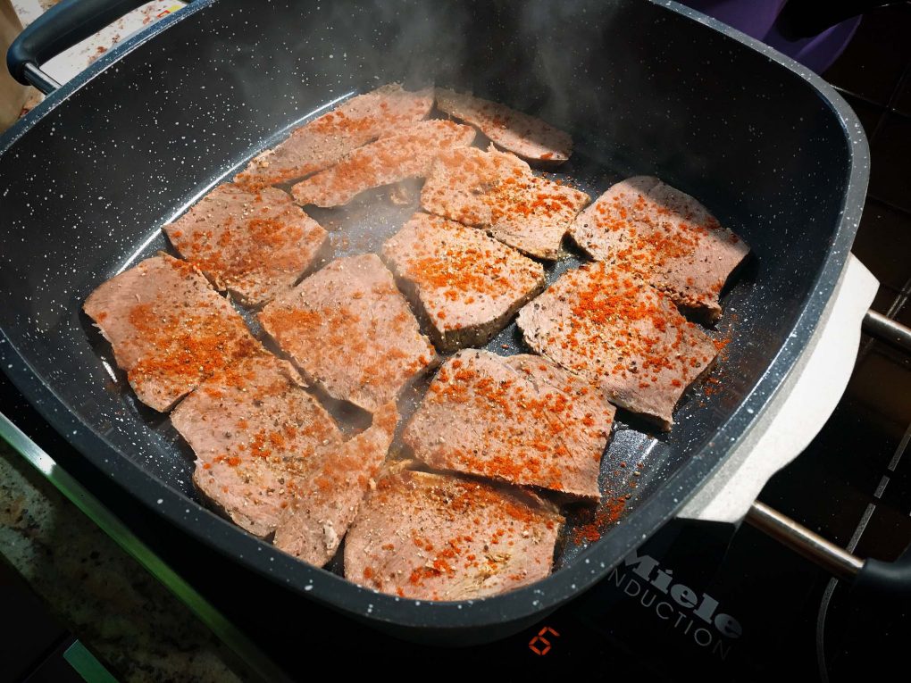 Das Fleisch wenden und von der anderen Seite ebenfalls kurz anbraten und würzen. Nach Bedarf noch etwas Sonnenblumenöl dazugeben.
