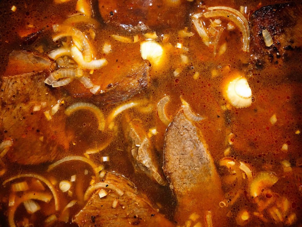 Die Zwiebelfleischstücke sollten geradeso vom Wasser bedeckt sein. Für eine Weile bei niedriger bis mittlerer Temperatur simmern lassen.