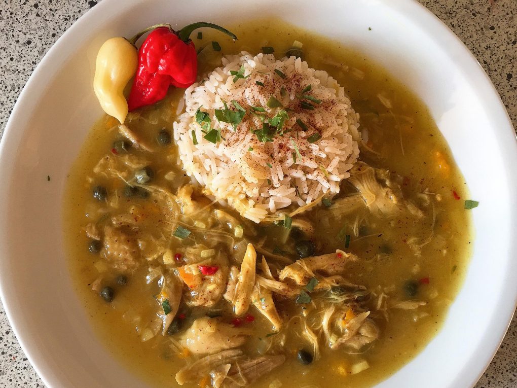 Rezept für Indisches Hühnerfrikassee mit Curry Madras. Für das Hühnerfrikassee Indischer Art wird das Huhn zunächst mit Brühe in einem Topf gekocht. Anschließend wird das Fleisch vom Knochen gelöst und zusammen mit der Currysauce serviert. Die würzige indische Currysauce wird aus Zwiebeln, Knoblauch und Kapern sowie indischen Bhut Jolokia Chilis und der Hühnerbrühe zubereitet. Besonders lecker schmeckt das indische Hühnerfrikassee mit scharfen indischen Bhut Jolokia Chilis und Reis.