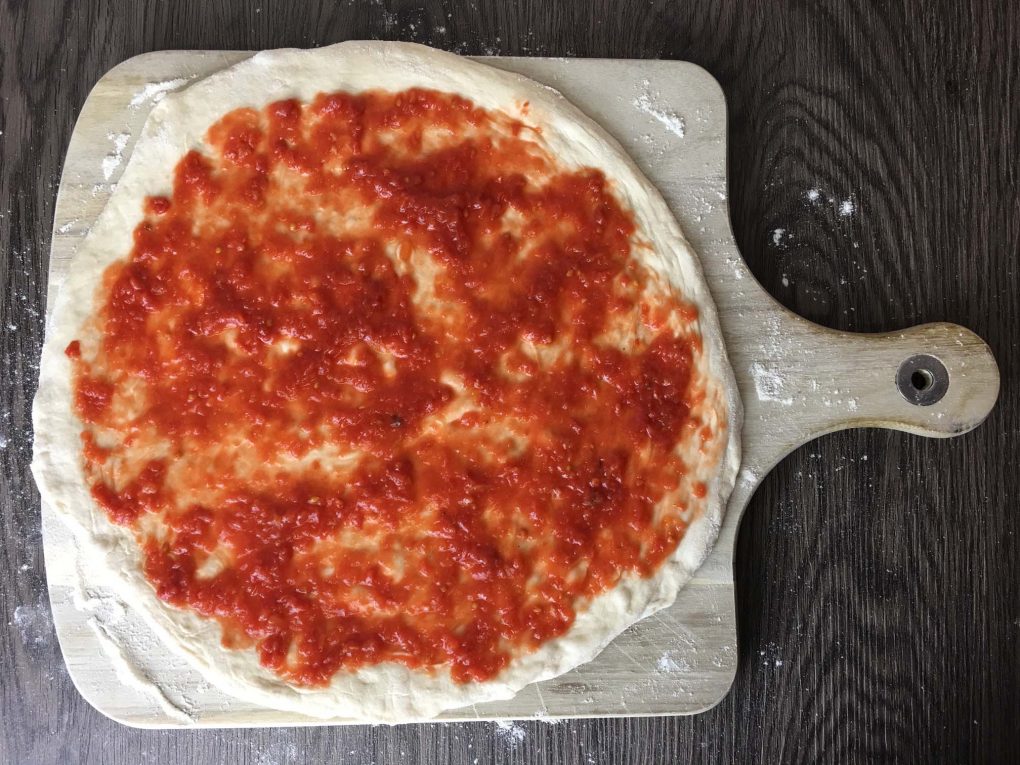 Den Teig nun mit Ausnahme des Randes mit selbstgemachter Tomatensauce bestreichen. Für den besten Geschmack sonnengereifte San Marzano Tomaten aus Italien verwenden.