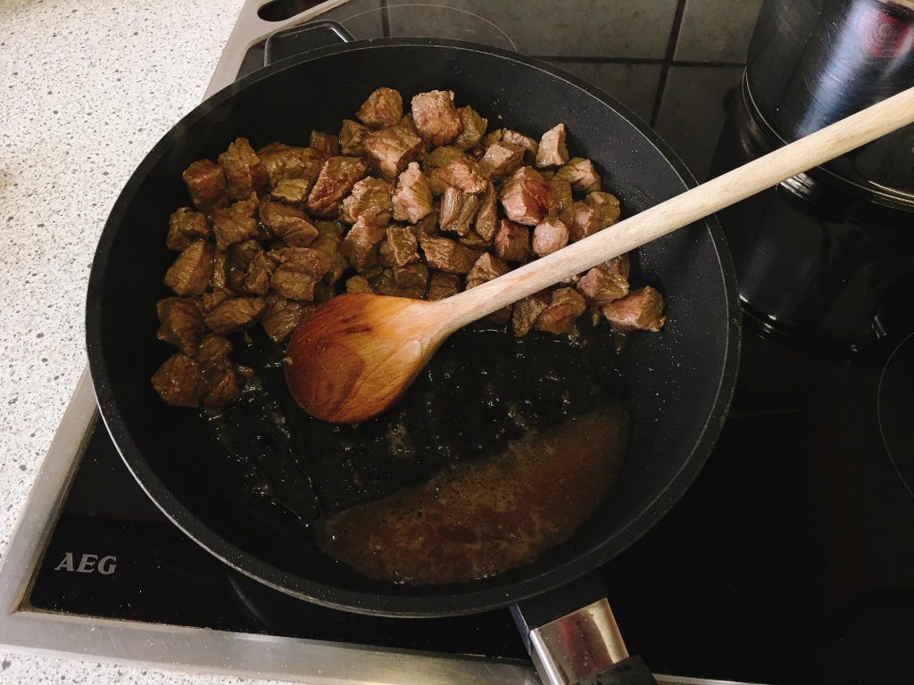 Die Rindfleischwürfel bei höchster Temperatur in einer Pfanne scharf anbraten. Gelegentlich mit einem Kochlöffel rühren. Hilfreich ist es, das Fleisch in 2 Portionen á 500 g anzubraten.