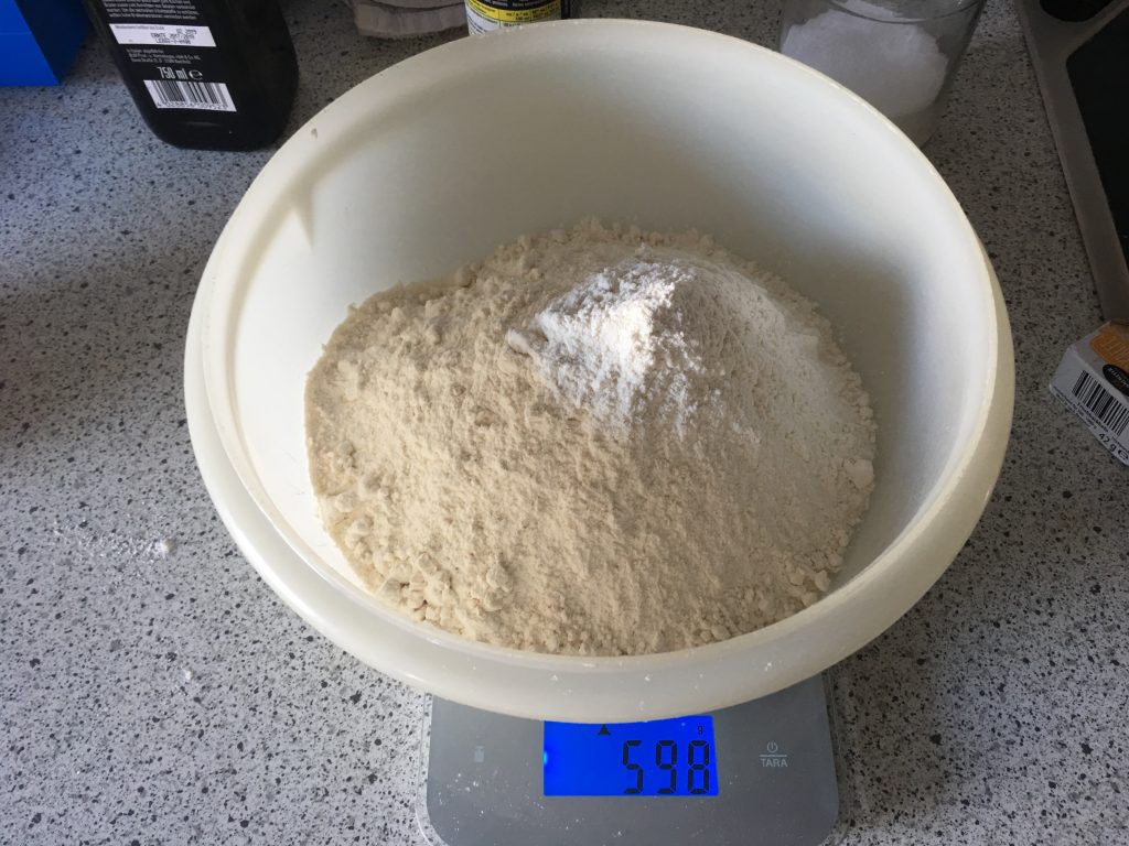 „……..5 g Bierhefe und 30 g Salz dazugeben und gut mit dem Wasser verrühren. Alternativ kann frische Backhefe verwendet werden“………….