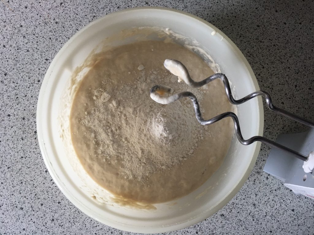 Das Wasser-Hefe-Salz Gemisch in die Rührschüssel geben und mit dem Mehl zu einem Vorteig verrühren. Hierfür reicht es etwas mit einer Gabel zu rühren.