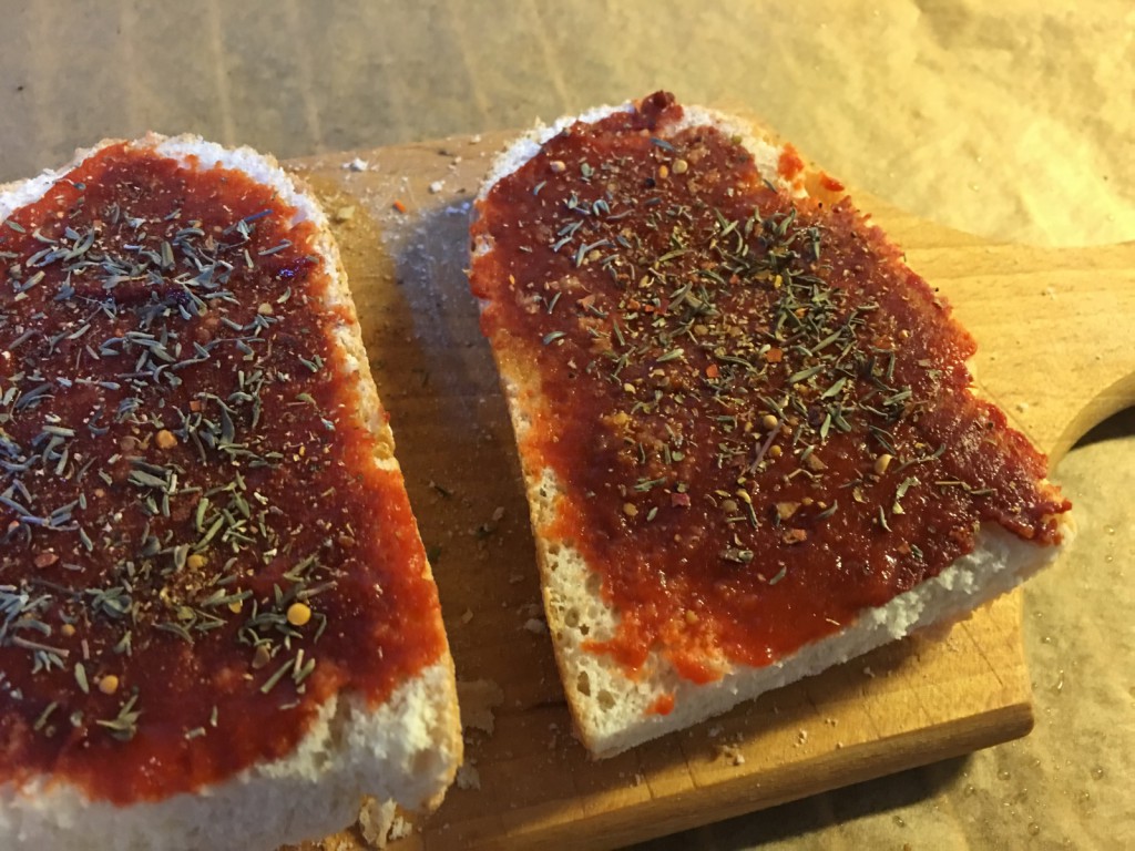 Anschließend die Tomatensauce darauf verstreichen und mit Oregano, Thymian und Rosmarin würzen.