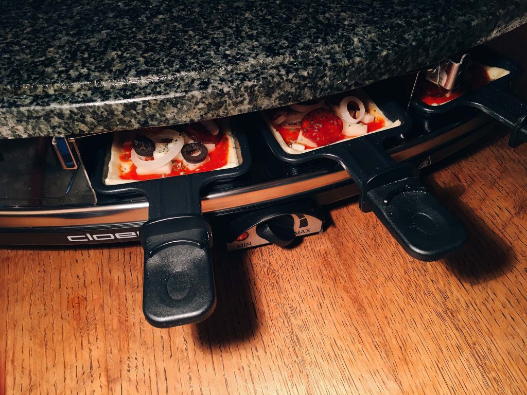 Wir bevorzugen das Backen im Raclette. Dort benötigen die Pizza-Pfännchen je nach eingestellter Temperatur und Belag rund 10 bis 12 Minuten.