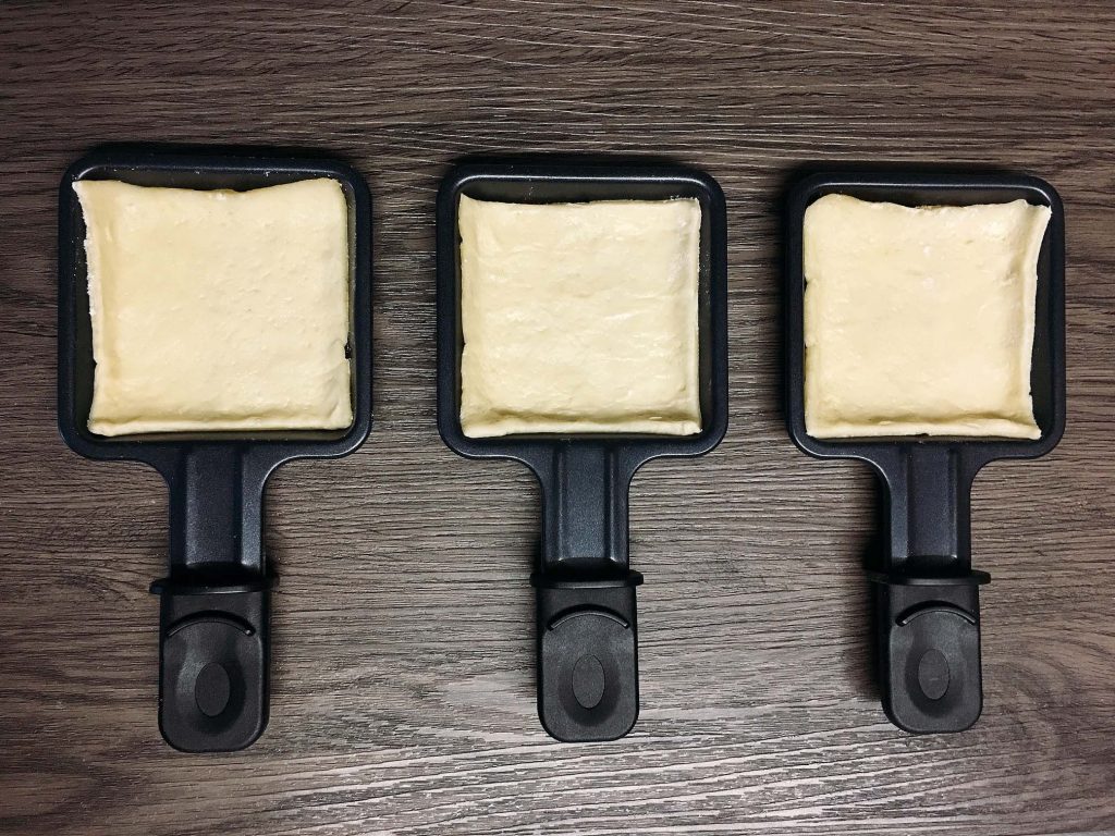 Zunächst einen Pizzateig nach folgendem Rezept herstellen: Original Italienischer Pizzateig. Alternativ einen fertigen Pizzateig kaufen. Dieser ist meist schon auf Backpapier vorgerollt und braucht nur noch in die passende Größe geschnitten werden. Hierfür einfach ein Raclette Pfännchen beim Schneiden als Größenvorlage nehmen.