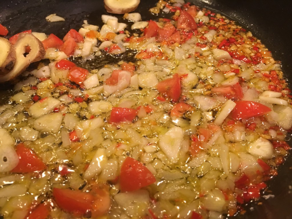 Währenddessen die geschnittene Chili und den Knoblauch mit einem guten Schuss italienischen Olivenöl in einer großen Bratpfanne anschwitzen. Anschließend mit dem Weißwein ablöschen und weiter ziehen lassen.