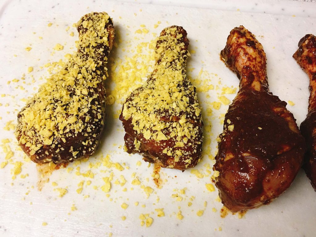 Die marinierten Hähnchenteile nun mit den Chipsbröseln bestreuen. Noch besser schmeckt das Hähnchenfleisch, wenn man die Marinade über Nacht im Kühlschrank einziehen lässt.