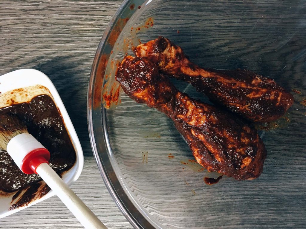 Hähnchenschlegel auf einem Küchenbrett anrichten und rundum gut mit der Sriracha Marinade bestreichen.