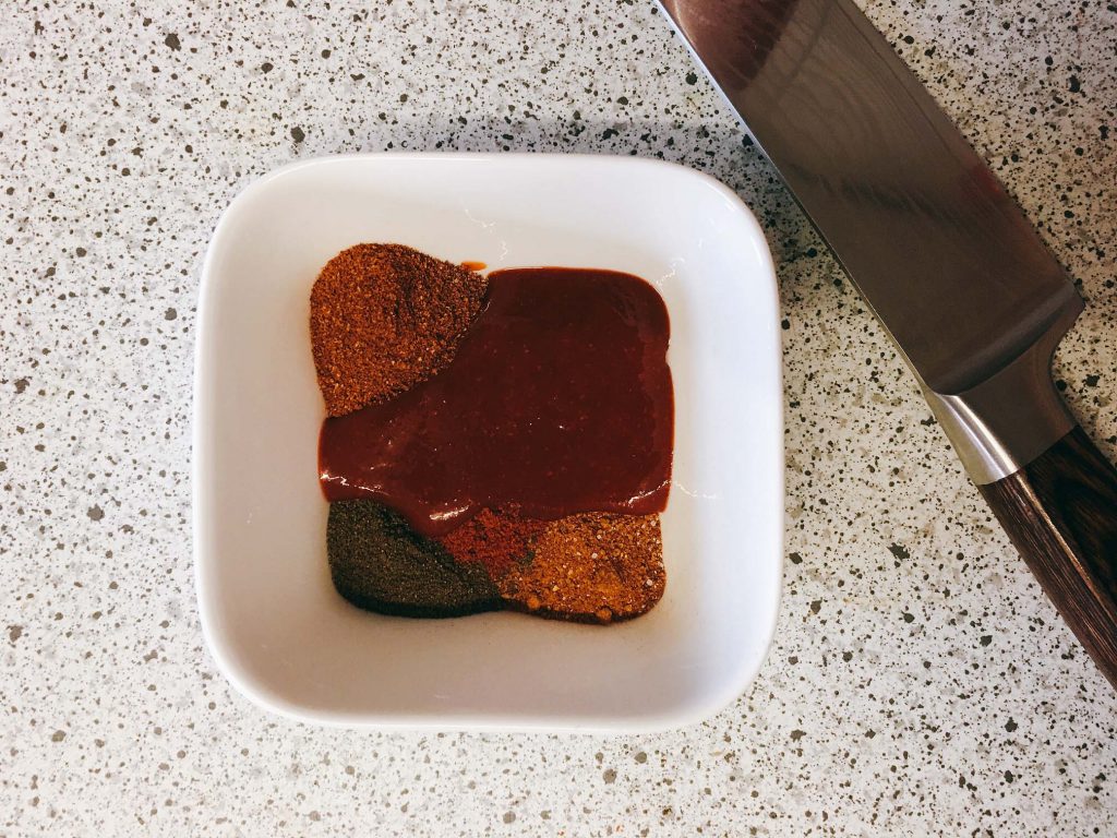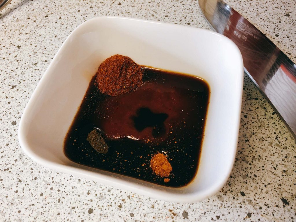 Die Gewürze und die Saucen mit einem kleinen Löffel oder Schneebesen vermengen, bis eine gleichmäßige Masse entsteht. Ist die Marinade zu dickflüssig kann noch ein Esslöffel Sojasauce hinzugegeben werden.